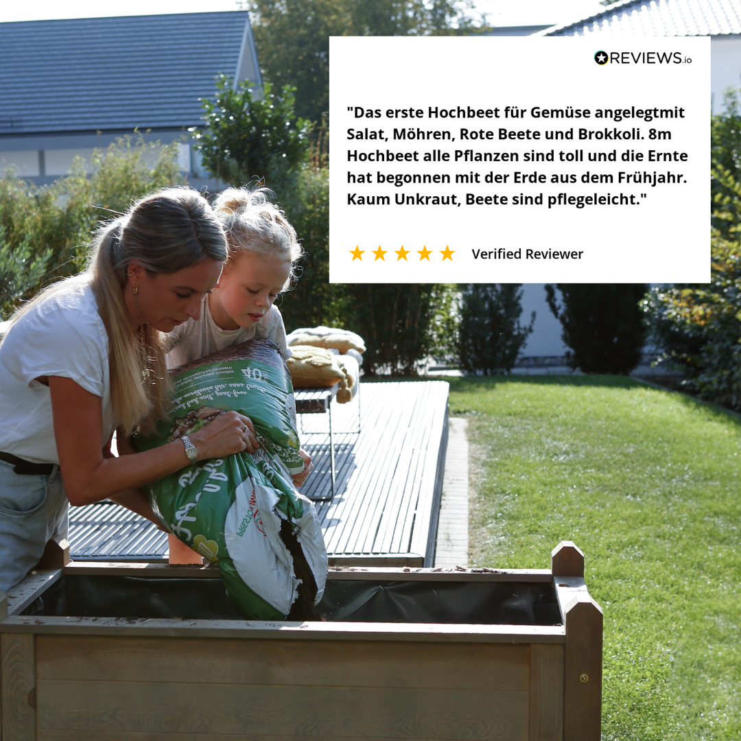 - Torffrei und nachhaltig: Unsere Hochbeeterde schützt die Umwelt und sorgt für klimafreundliches Gärtnern.