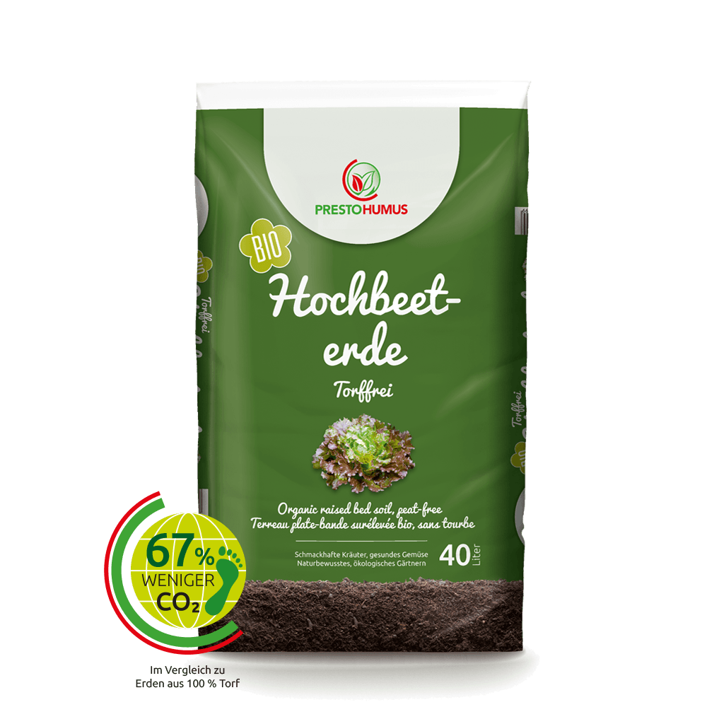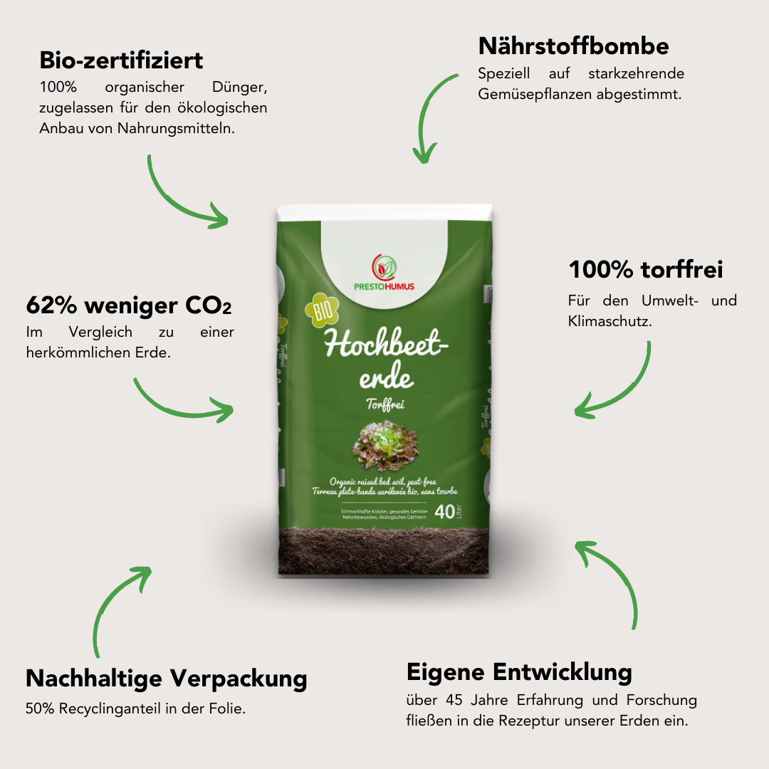 Mit der Presto Humus Bio-Hochbeeterde entscheidest du dich für ein hochwertiges, nachhaltiges Produkt, das speziell für die Anforderungen von Hochbeeten entwickelt wurde. Unsere Hochbeeterde ist torffrei, klimafreundlich und bietet deinen Pflanzen ideale Wachstumsbedingungen.
