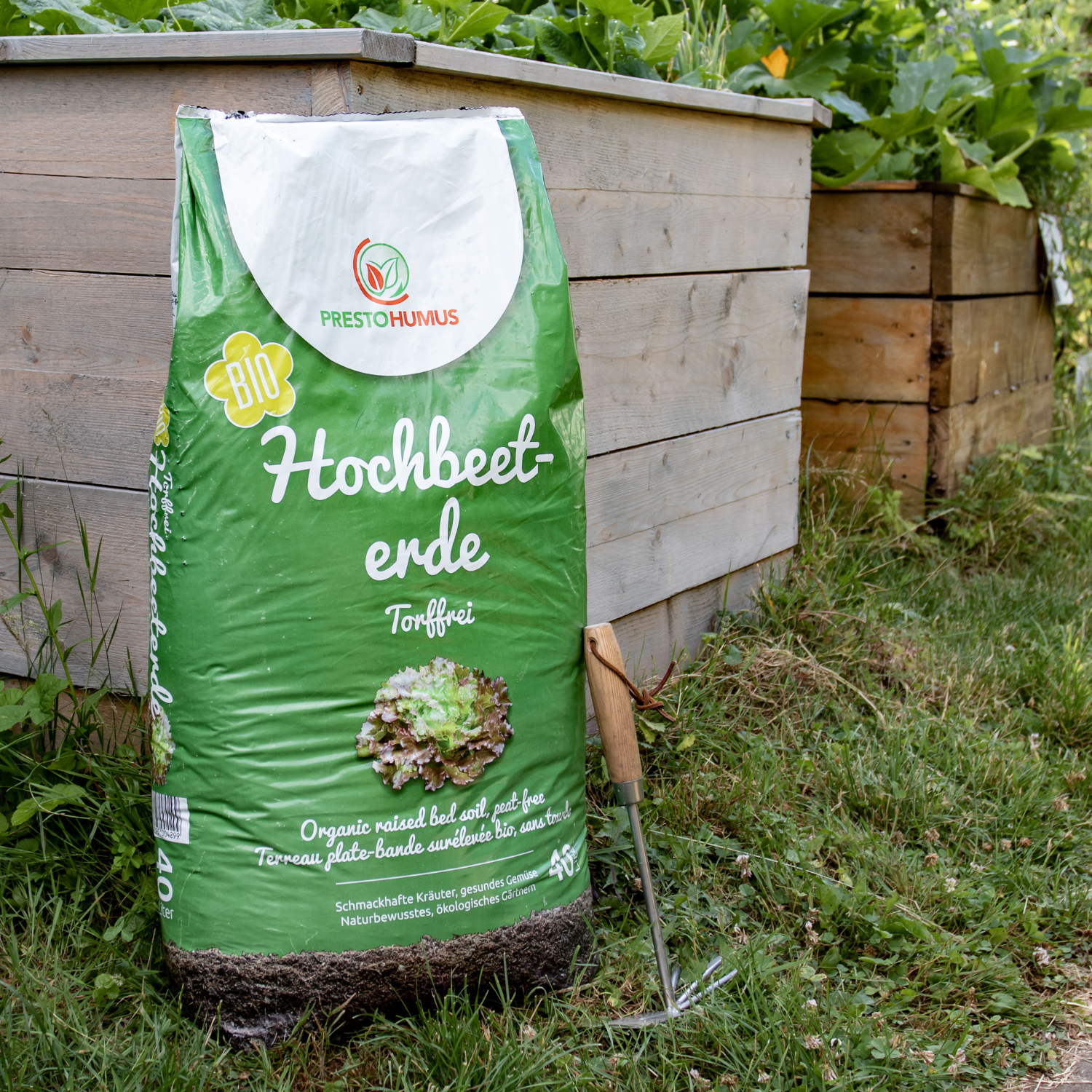 - Hochbeeterde (oberste Schicht): Unsere hochwertige Presto Humus Hochbeeterde als Pflanzschicht.