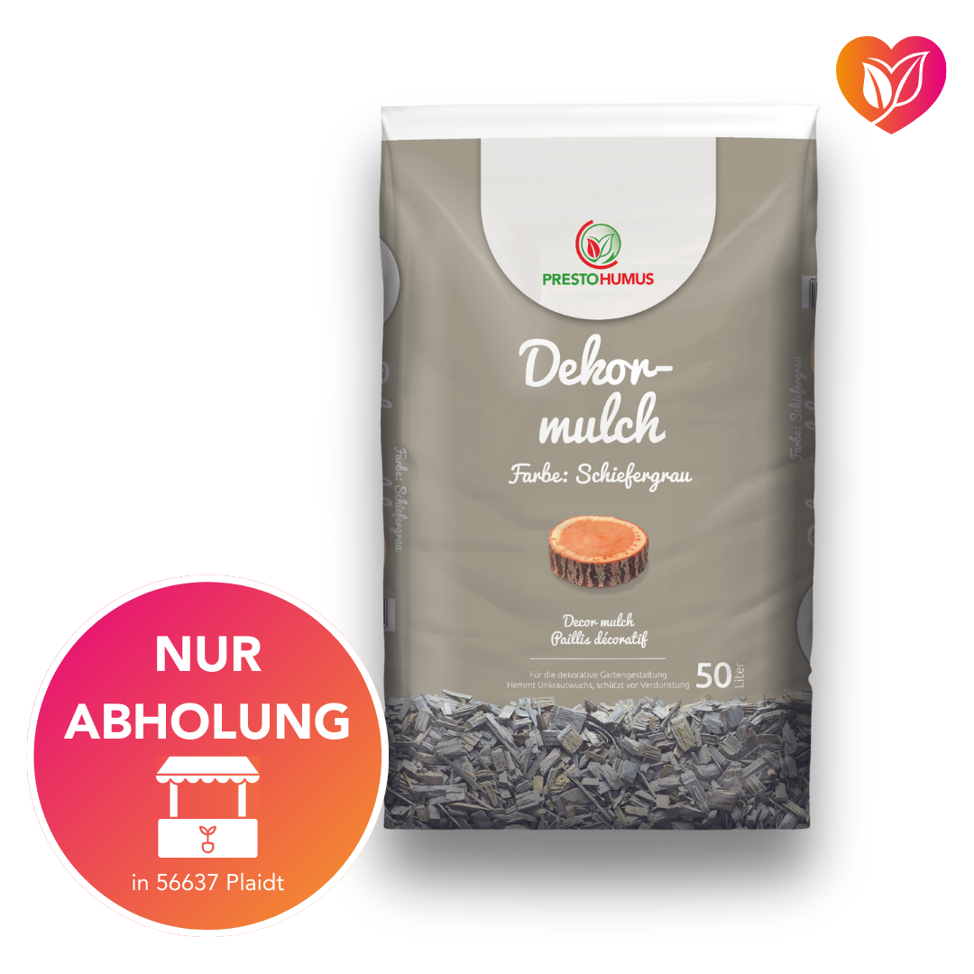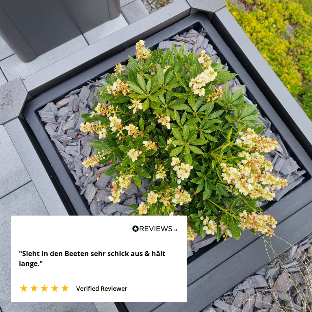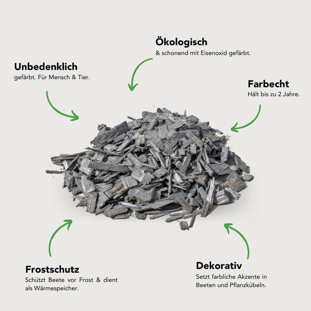 Ökologisch und schonend gefärbt Natürlicher Frostschutz und Wärmespeicher Für farbige Beete und bunte Pflanzkübel 50% Recyclinganteil in der FolieDekormulch grau für dezente Farben im Garten