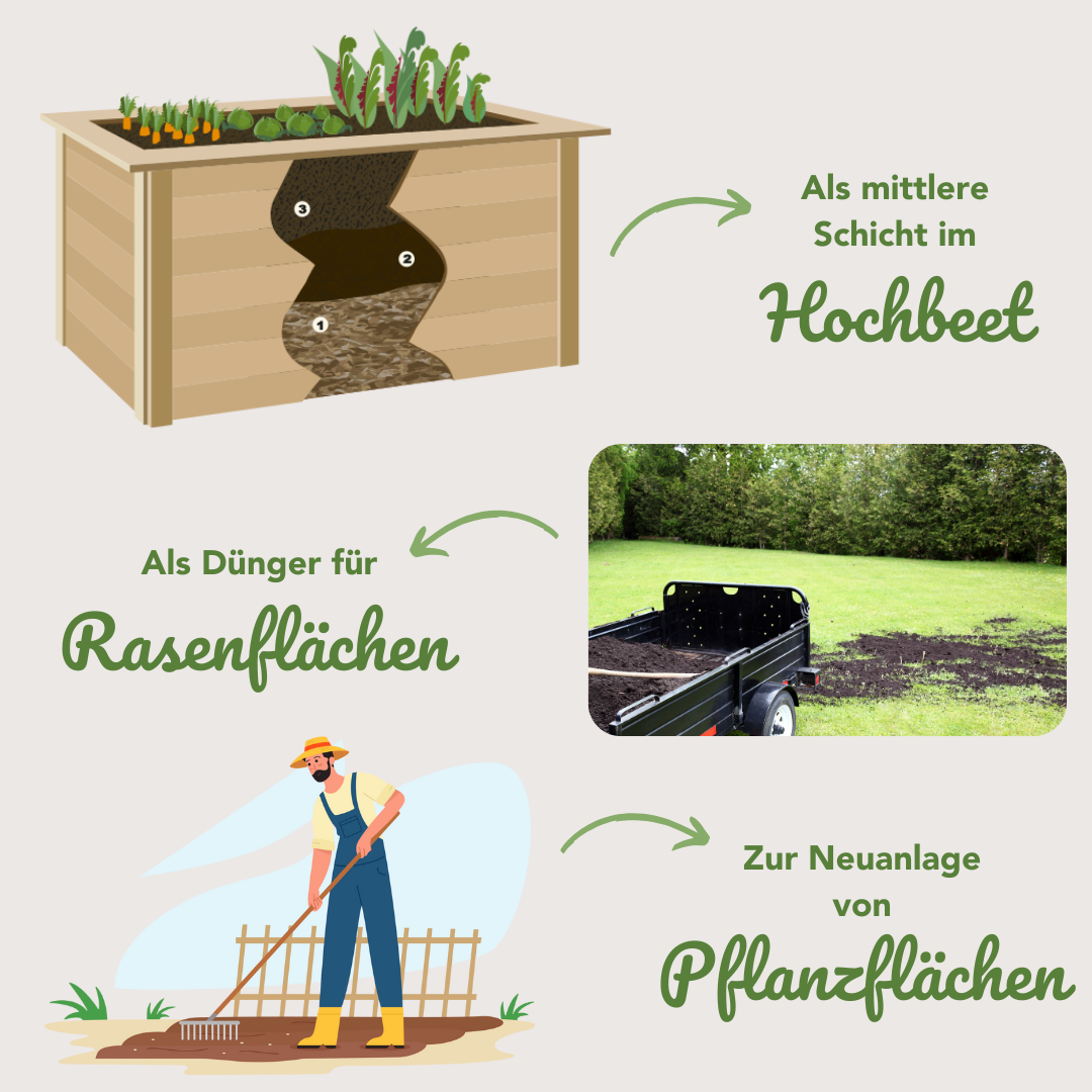 Hochbeete: Als mittlere Schicht, in Kombination mit dem Presto Humus Spielplatzdekor als Basis und der Presto Humus Bio-Hochbeeterde torffrei als oberer Abschluss.