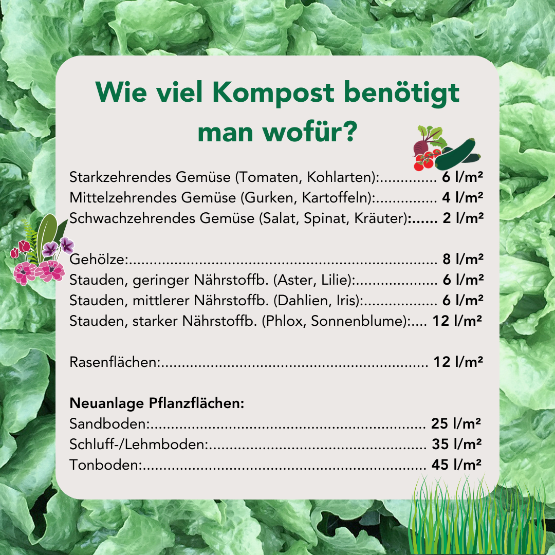- Starkzehrende Gemüsearten (Tomaten, Sellerie, Kohlarten): 6 l/m²