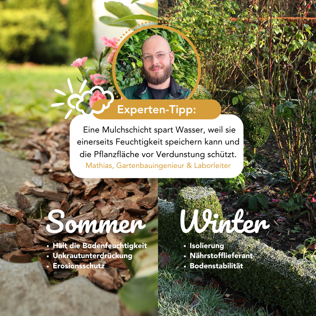 - Für Beete und Rabatten den Mulch in ca. 5-7 cm Stärke auftragen
